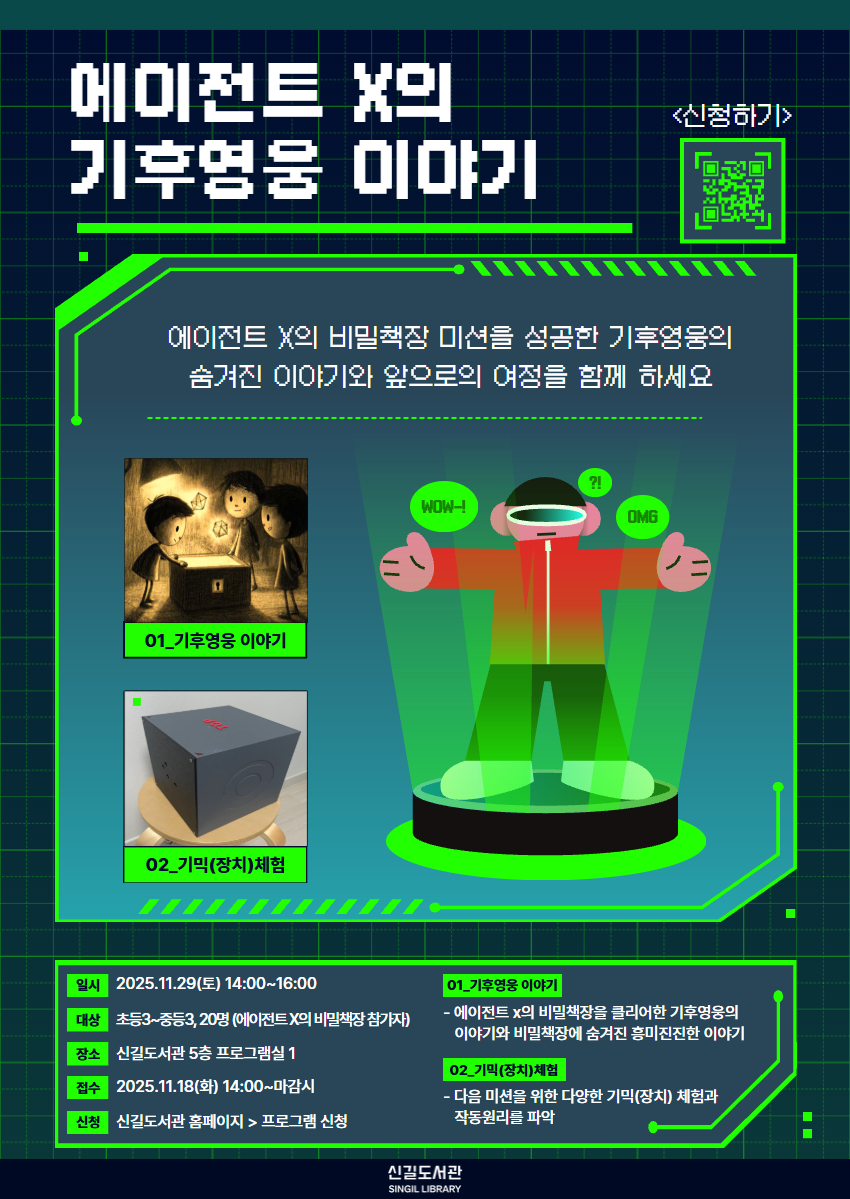 ![]() 👨🏽⚕️에이전트 X의 비밀영웅 이야기🔦 에이전트 X의 비밀책장을 클리어한 기후영웅들에게 이 메시지를 보냅니다.✉ 에이전트 X의 비밀책장의 숨겨인 이야기와 왜 신길도서관에 기후와 도서관을 합쳐 이야기를 만들었는지 에이전트 X를 만나고 숨겨진 이야기를 들어보세요.🥰 *에이전트 X의 비밀책장을 참가한 분들만 참석이 가능합니다.* ▪️ 프로그램 일시: 11월 29일 토요일 14:00~16:00 ▪️ 장소: 신길도서관 5층 프로그램실 1 ▪️ 대상: 초등학교 3학년~중등 3학년, 20명 (에이전트 X의 비밀책장 참가자) ▪️ 모집일시: 11월 18일(화) 오후 2시부터 ~마감시 ▪️ 신청방법: 신길도서관 홈페이지 로그인 후 프로그램 신청 (정회원만 신청 가능) ✔️ 프로그램 중 촬영된 사진은 비영리 목적의 도서관 홍보에 사용될 수 있으며, 프로그램 신청 시 이에 동의한 것으로 간주됩니다. 📞문의: 02-2165-7700 |