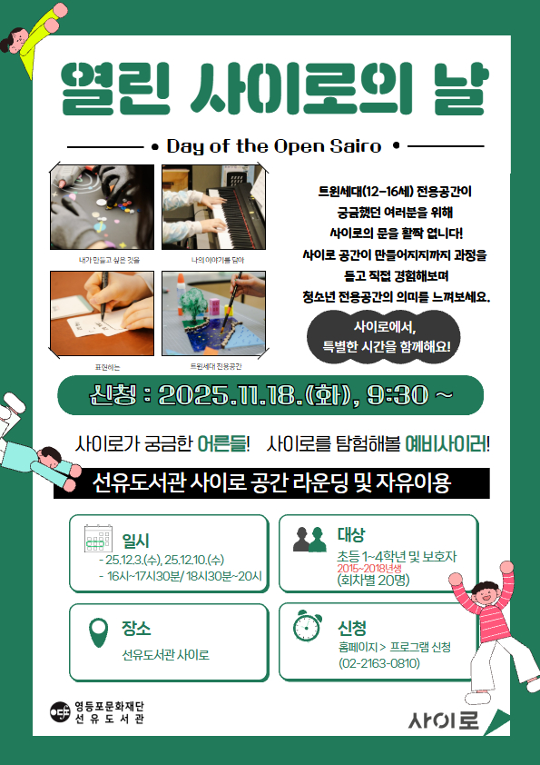 <열린 사이로의 날> ►일시 : 12.3, 12.10(수) 16시~17시30분 , 18시30분 ~20시 ►장소 : 선유도서관 사이로 2~3층 ►대상 : 초등 1~4학년 및 학부모 20명 _ 성인만 신청하는 경우 별도 전화 신청 부탁드립니다.(02-2163-0810) ► 동행인 여부에 보호자 성명 작성부탁드립니다. 보호자 동반시에만 사이로 입장이 가능합니다. (보호자 미동반 시 입장 제한)