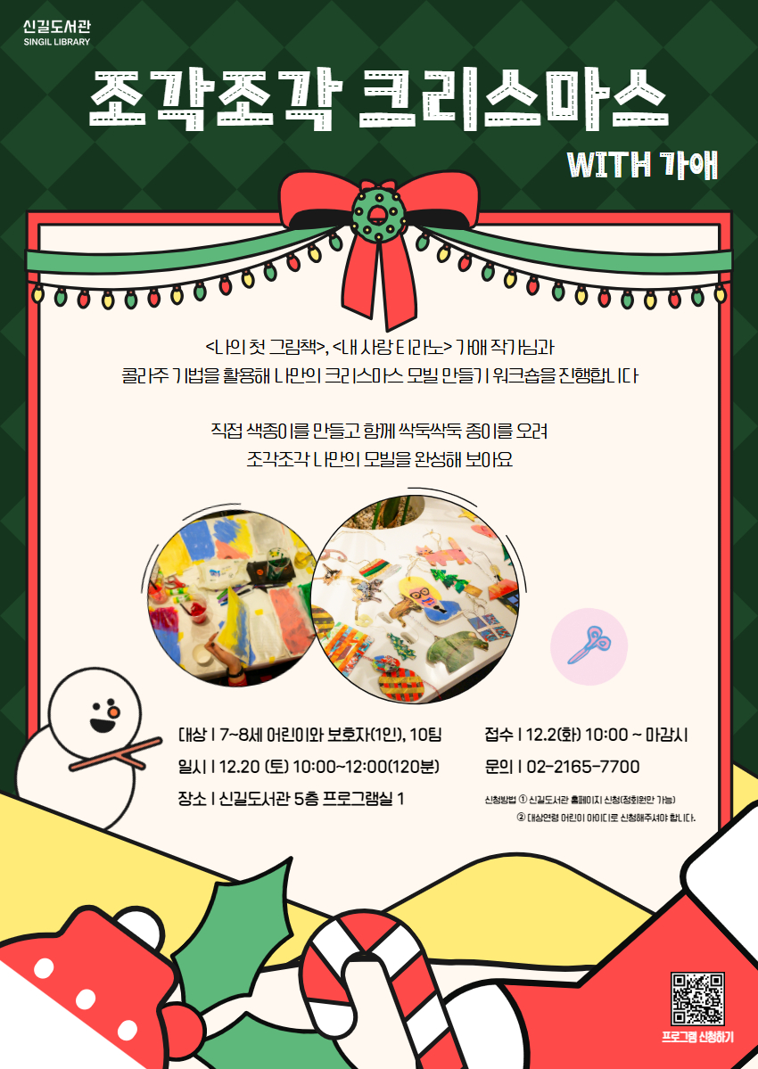<나의 첫 그림책>, <내 사랑 티라노> 가애 작가님과 콜라주 기법을 활용해 나만의 크리스마스 모빌 만들기 워크숍을 진행합니다 직접 색종이를 만들고 함께 싹둑싹둑 종이를 오려 조각조각 나만의 모빌을 완성해 보아요 ▪️강연 일시: 12.20(토) 10:00~12:00 ▪️ 장소: 신길도서관 5층 프로그램실 1 ▪️ 대상: 7~8세(2018~2019년생) 어린이와 보호자(1인), 10팀 ▪️ 모집일시: 12월 2일(화) 오전 10시부터 ~마감시 ▪️ 신청방법: 신길도서관 홈페이지 로그인 후 프로그램 신청 (정회원만 신청 가능) ✔️ 프로그램 중 촬영된 사진은 비영리 목적의 도서관 홍보에 사용될 수 있으며, 프로그램 신청 시 이에 동의한 것으로 간주됩니다. 정원이 적은 프로그램으로, 참여자 및 강사를 위해 반드시 참석 가능한 분만 신청 부탁드립니다. 📞문의: 02-2165-7700 |