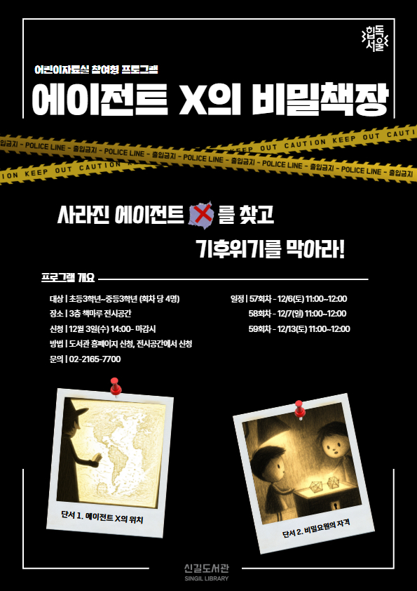 ![]() 에이전트 X의 비밀책장 사라진 에이전트 X를 찾아라! 기후위기의 마지막 단서를 가지고 있는 "에이전트 X" 그 단서를 신길도서관 어딘가에 놓고 사라졌다. 에이전트 X의 미션을 받은 여러분들은 지금부터 기후위기를 해결할 요원이 되어 도서관에 있는 단서를 해결하라! • 회 차: 57회차 - 12.6(토) 11:00 58회차 - 12.7(일) 11:00 59회차 - 12.13(토) 11:00 ✔️ 회차별로 날짜가 다르니 꼭 확인 후 신청해주세요. ✔️ 회차별 중복신청은 불가합니다. • 장 소: 신길도서관 3층 책마루 전시공간 • 대 상: 초등학교 3학년 ~ 중학교 3학년 (1회차 당 4명) • 신 청: 홈페이지 접수, 현장 접수 ✔️ 프로그램 중 촬영된 사진은 비영리 목적의 도서관 홍보에 사용될 수 있으며, 프로그램 신청 시 이에 동의한 것으로 간주됩니다. ✔️ 프로그램 중 진행된 미션의 내용 및 정답은다음 이용자를 위해 공유를 금지합니다. ✔️ 프로그램 참여자분들은 사전에 받은 문제를 미리 해결해야 프로그램을 진행하실 수 있습니다. 📞문의: 02-2165-7700 |