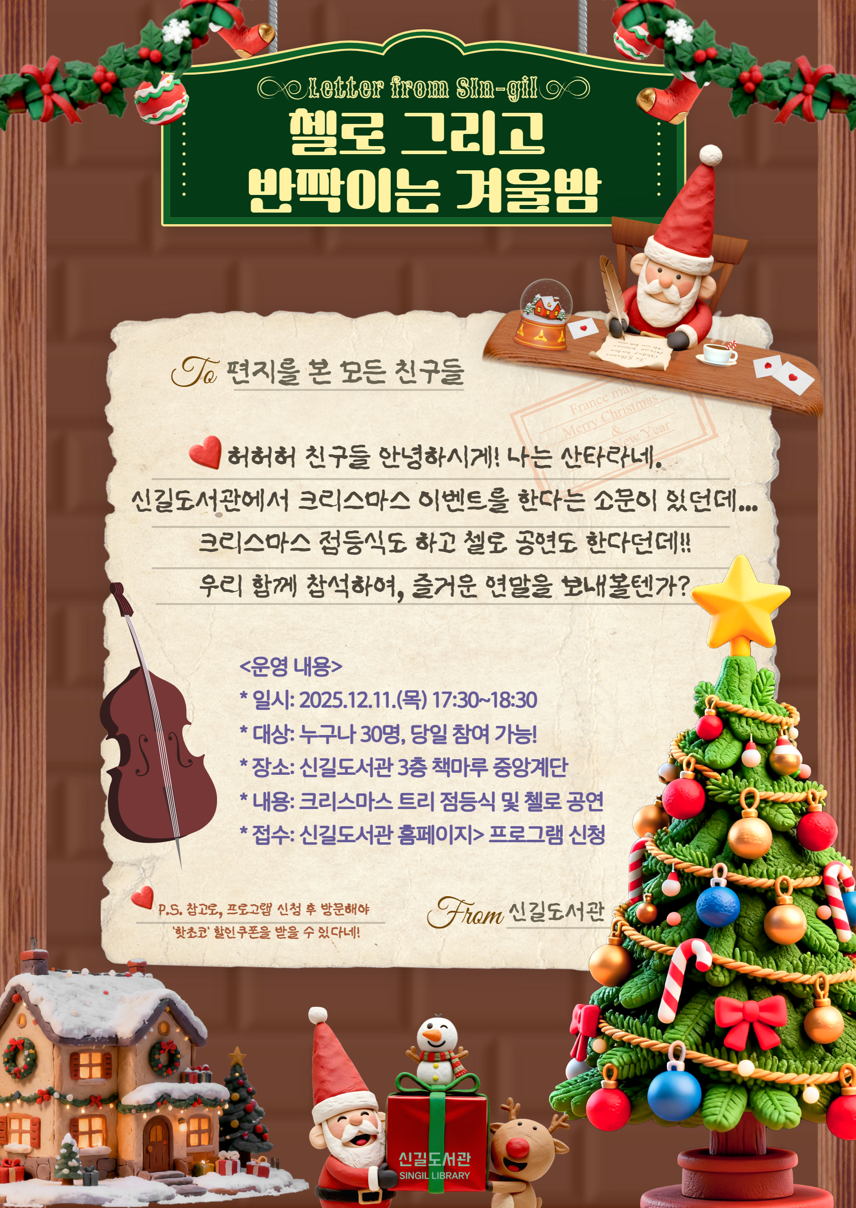 * 프로그램 접수 없이도 현장 참석 가능합니다![]() 🎄첼로 그리고 반짝이는 겨울밤🎁 🎅신길도서관에 찾아 온 첫 크리스마스! 신길도서관 3층 책마루 중앙계단에 생긴 트리를 보셨나요? 크리스마스 트리 불을 함께 켜고 싶어, 현재 기다리고 있습니다. 12월 11일 목요일 17:30 아름다운 선율의 첼로와 함께 크리스마스 점등식에 함께 하시겠어요? * 프로그램 신청 후 참여하신 분들에게는 작은 선물도 드립니다 - 포스터 속 힌트를 찾아보세요! <운영 내용> * 일시: 2025.12.11.(목) 17:30~18:30 * 대상: 누구나 30명, 당일 참여 가능! * 장소: 신길도서관 3층 책마루 중앙계단 * 내용: 크리스마스 트리 점등식 및 첼로 공연 * 접수: 신길도서관 홈페이지> 프로그램 신청 ✔️ 프로그램 중 촬영된 사진은 비영리 목적의 도서관 홍보에 사용될 수 있으며, 프로그램 신청 시 이에 동의한 것으로 간주됩니다. 정원이 적은 프로그램으로, 참여자 및 강사를 위해 반드시 참석 가능한 분만 신청 부탁드립니다. 📞문의: 02-2165-7700 |
