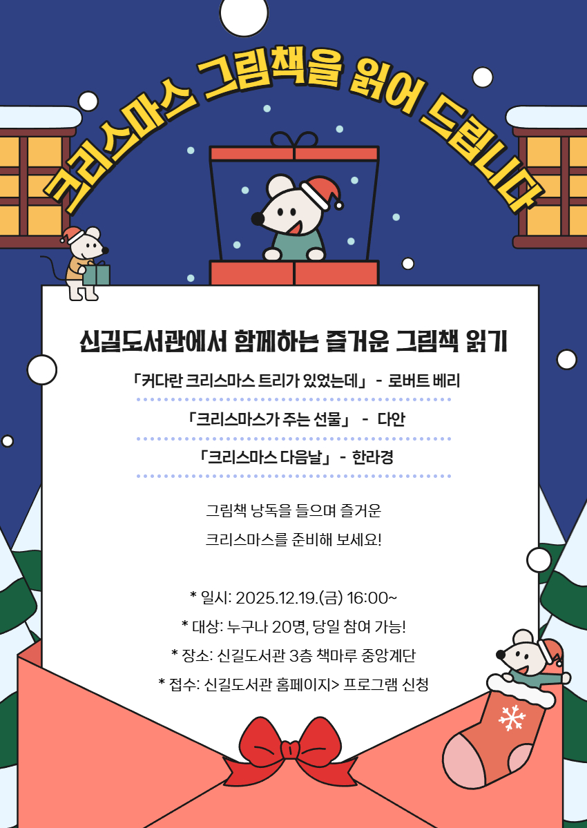 ![]() 🎄크리스마스 그림책을 읽어드립니다!🎁 🎅신길도서관에 찾아 온 첫 크리스마스! 신길도서관 3층 책마루 중앙계단에 생긴 트리를 보셨나요? 예쁜 트리앞에서 함께 크리스마스 그림책을 읽어보아요 <운영 내용> * 일시: 2025.12.19.(금) 16:00~17:00 * 대상: 누구나 20명, 당일 참여 가능! * 장소: 신길도서관 3층 책마루 중앙계단 * 내용: 크리스마스 그림책 낭독 * 접수: 신길도서관 홈페이지> 프로그램 신청 ✔️ 프로그램 중 촬영된 사진은 비영리 목적의 도서관 홍보에 사용될 수 있으며, 프로그램 신청 시 이에 동의한 것으로 간주됩니다. 📞문의: 02-2165-7700 |