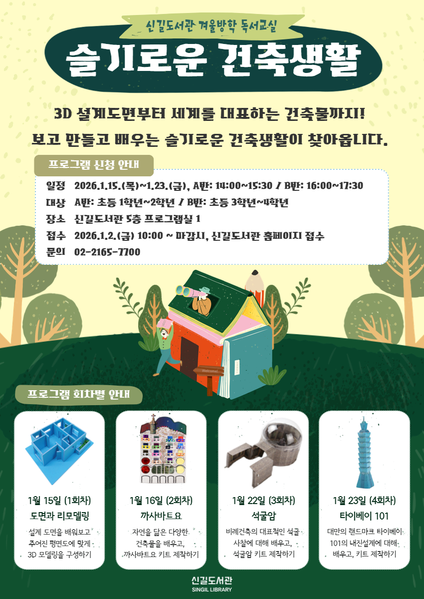 ![]() ⛄️슬기로운 건축생활🏛️ (B반) 3D 설계도면부터 세계를 대표하는 건축물까지! 보고 만들고 배우는 슬기로운 건축생활이 찾아옵니다. ▪️프로그램 일정: 2026년 1월 15일(목)~ 1월 23일(금) 매주 목요일, 금요일 16:00~17:30 ▪️ 장소: 신길도서관 5층 프로그램실 1 ▪️ 대상: 초등 3학년~4학년 (2016~2017년생), 10명 ▪️ 모집일시: 2026년 1월 2일(금) 오전 10시부터 ~마감시 ▪️ 신청방법: 신길도서관 홈페이지 로그인 후 프로그램 신청 (정회원만 신청 가능) ✔️ 프로그램 중 촬영된 사진은 비영리 목적의 도서관 홍보에 사용될 수 있으며, 프로그램 신청 시 이에 동의한 것으로 간주됩니다. ✔️A반, B반 연령별로 프로그램 신청 페이지 및 프로그램 시간이 다르니 연령 확인 후 신청해주세요. ✔️회차별 프로그램으로, 모든 회차에 참석 가능한 분만 신청 바랍니다. 📞문의: 02-2165-7700 |