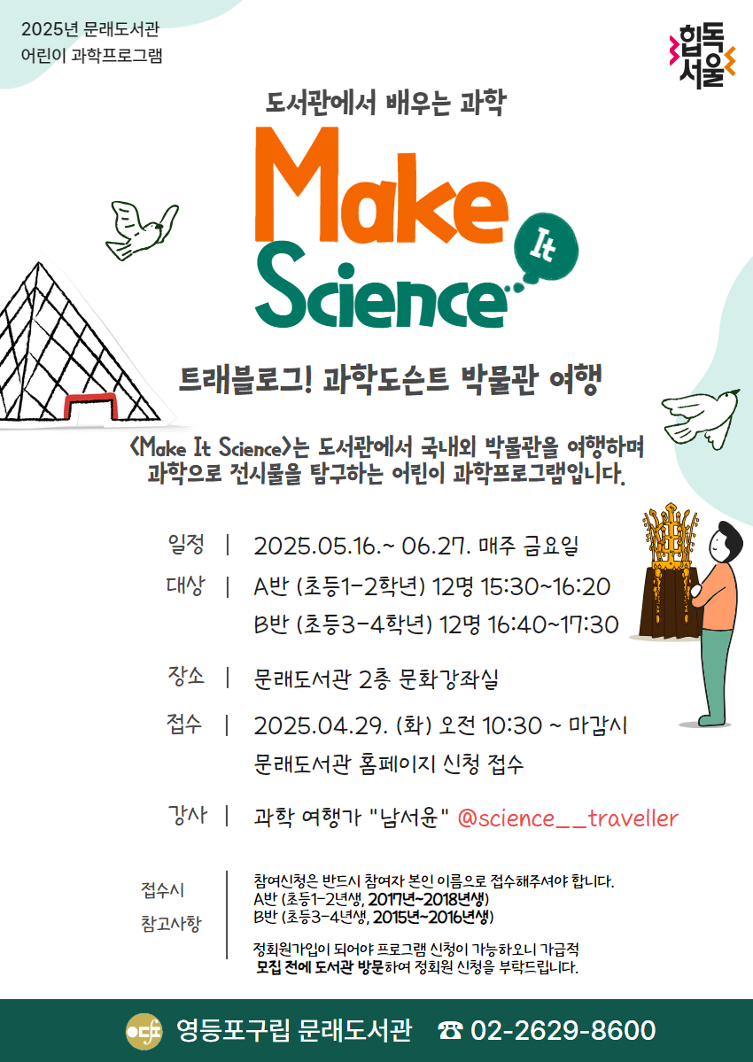 문래도서관 2025년 어린이 과학프로그램 <Make It Science> A반 접수 페이지 입니다. 1학년(2018년)~2학년(2017년) 12명 / 15:30~ 16:20 각 반마다 연령제한이 있으며, 자녀이름(정회원)으로만 접수 가능합니다. 모든 수업에 빠짐없이 참여가 가능한 어린이만 신청하여 주시기 바랍니다. ![]() 대상 및 시간 : - A반: 1학년(2018년)~2학년(2017년) 12명 / 15:30~ 16:20 - 각 반마다 연령제한이 있으며, 자녀이름(정회원)으로만 접수 가능합니다. (정회원만 신청가능합니다.- 홈페이지 준회원 가입 후 도서관에서 정회원으로 전환하셔야 합니다.) 운영기간 : 2025년 5월 16일 부터 6월 27일 까지 매주 금 총 6회 강사 : 남서윤 (과학 커뮤니케이터) 강의장소 : 문래도서관 2층 문화강좌실 접수 : 2025년 4월 29일 화요일 10시 30분 부터 도서관 홈페이지 프로그램신청에서 가능 문의 : 02-2629-8600 |